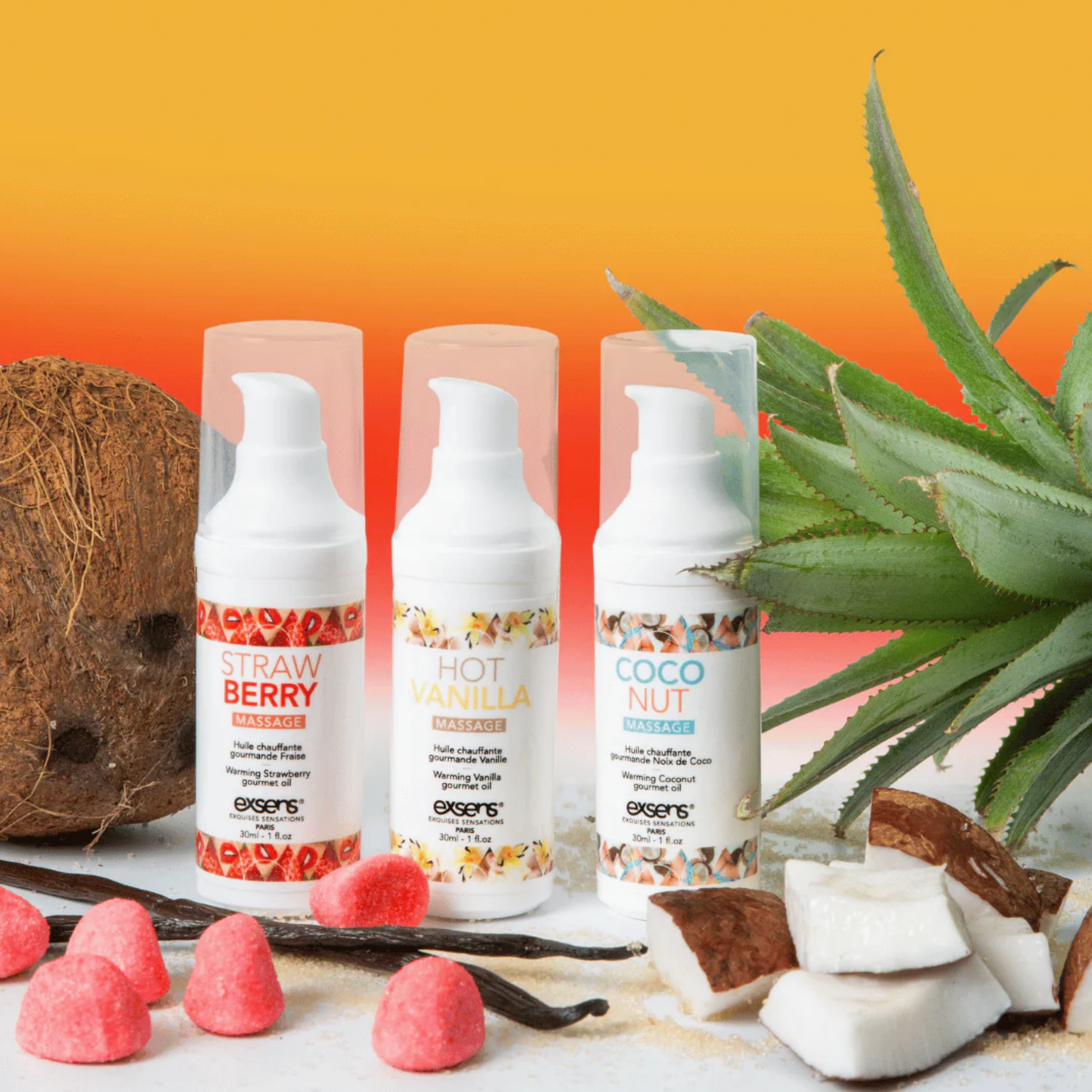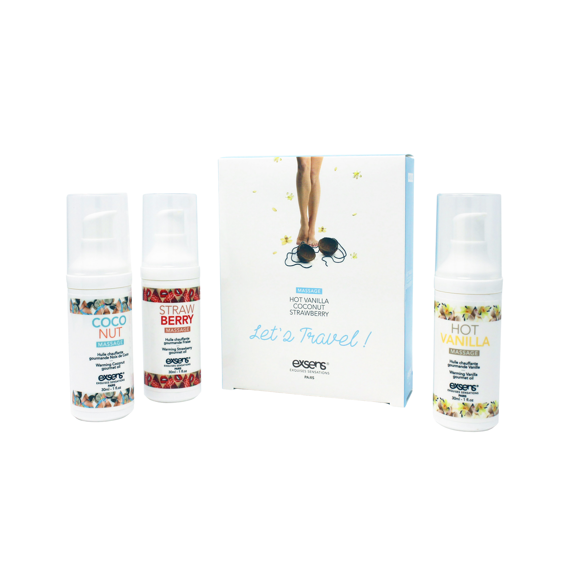 Treat yourself on the go with our Let's Travel! Warming Intimate Massage gel kit. Includes three travel-sized, gourmet-flavored pleasure enhancers (Hot Vanilla, Strawberry, and Coconut) created for intimate foreplay and oral pleasure.