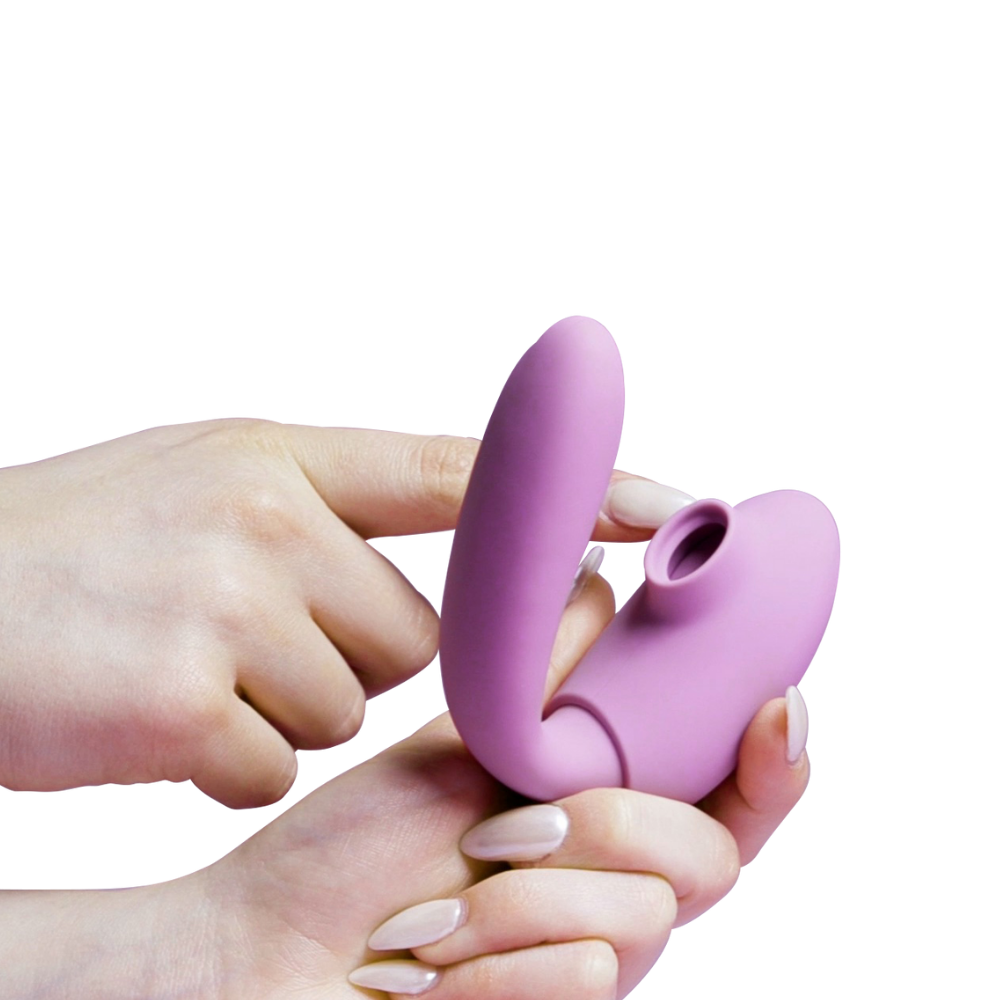 Luxe accents, air pressure, and G-spot stimulation come together in a feast for the senses. Let the insertable end tantalize with your choice of vibration speeds and patterns as the massager curves to nestle against your favorite pleasure point. Leave the sleeve on to surround your clitoris with gasp-worthy air pressure or remove it for thumping, pulsing clitoral stimulation. Which will you love more?